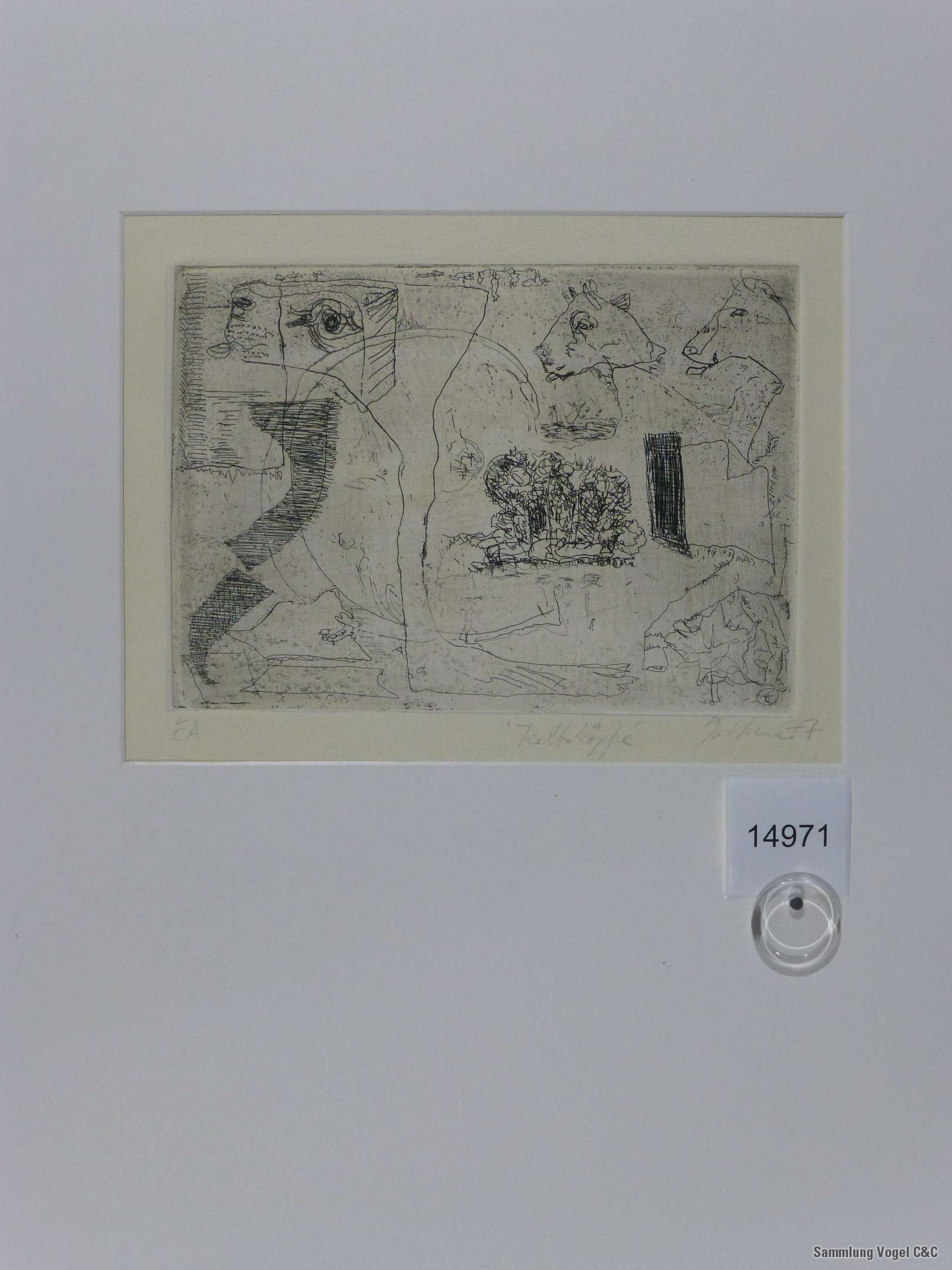 Beschriftung: bezeichnet u. l. (EA), betitelt u. m. ("Kalbsköpfe"), signiert und datiert u. r. (Goltzsche 77)
